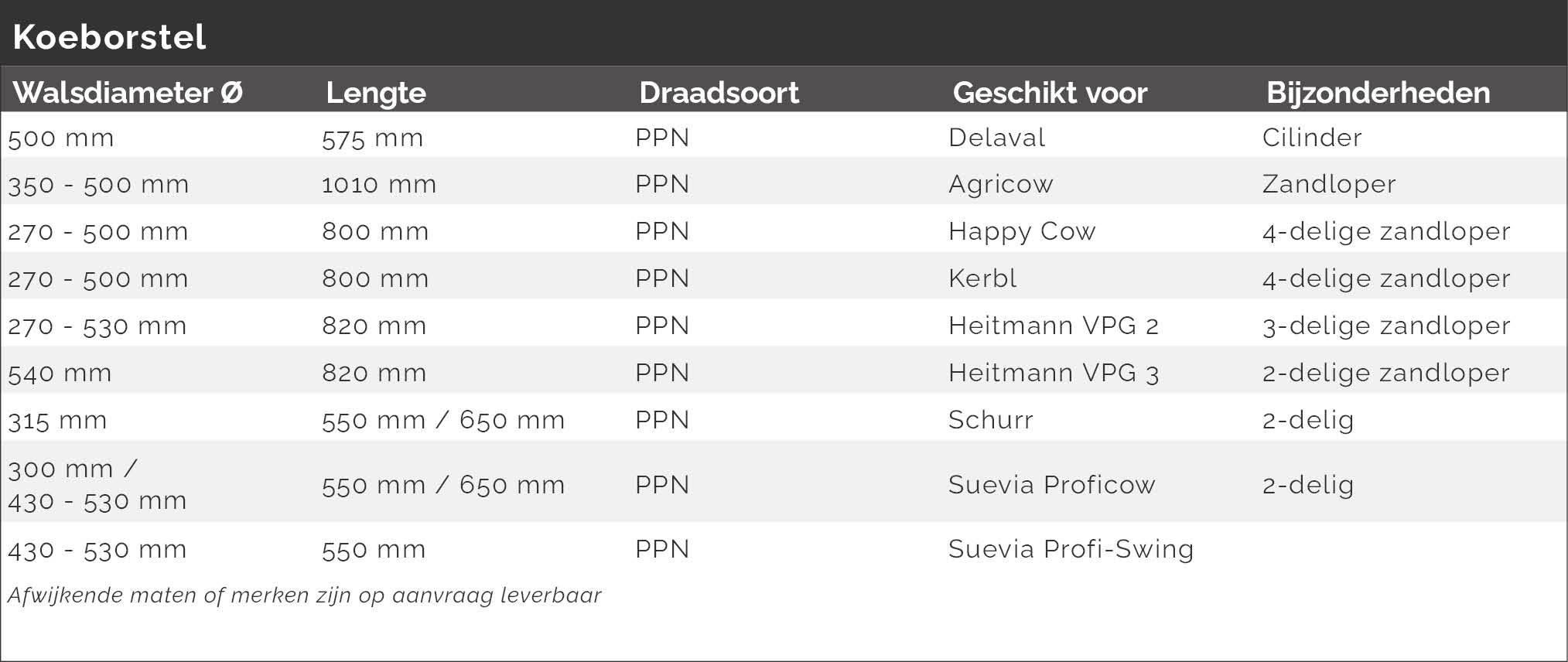 De koeborstel in de tabel zijn uit voorraad leverbaar. Staan jouw gewenste specificaties niet in deze lijst? We denken graag met je mee over een oplossing op maat voor jouw toepassing.
